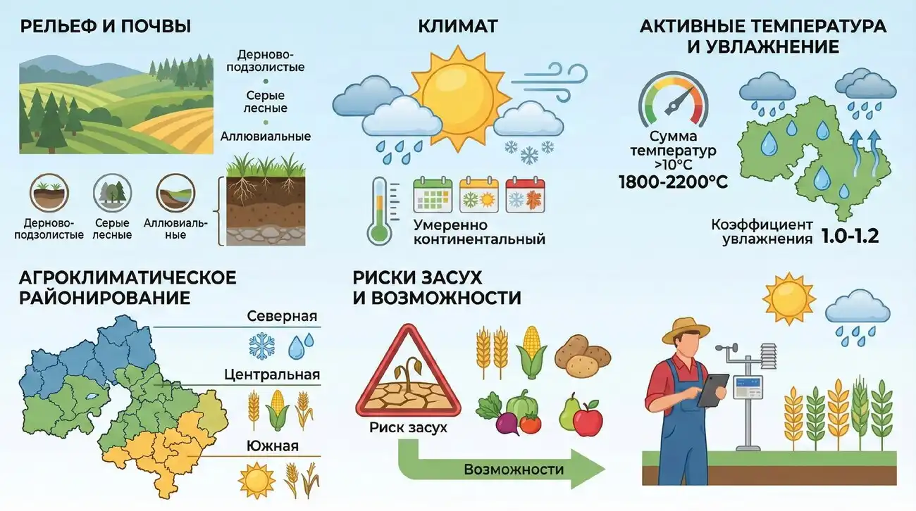 Здесь холмистые возвышенности, достигающие 300 метров, соседствуют с обширными низменностями, а зона смешанных лесов на севере постепенно переходит в лесостепь на юге. Это разнообразие рельефа, почвенного покрова и растительности формирует мозаику микроклиматов, которая прямым образом определяет потенциал и специализацию сельскохозяйственного производства.