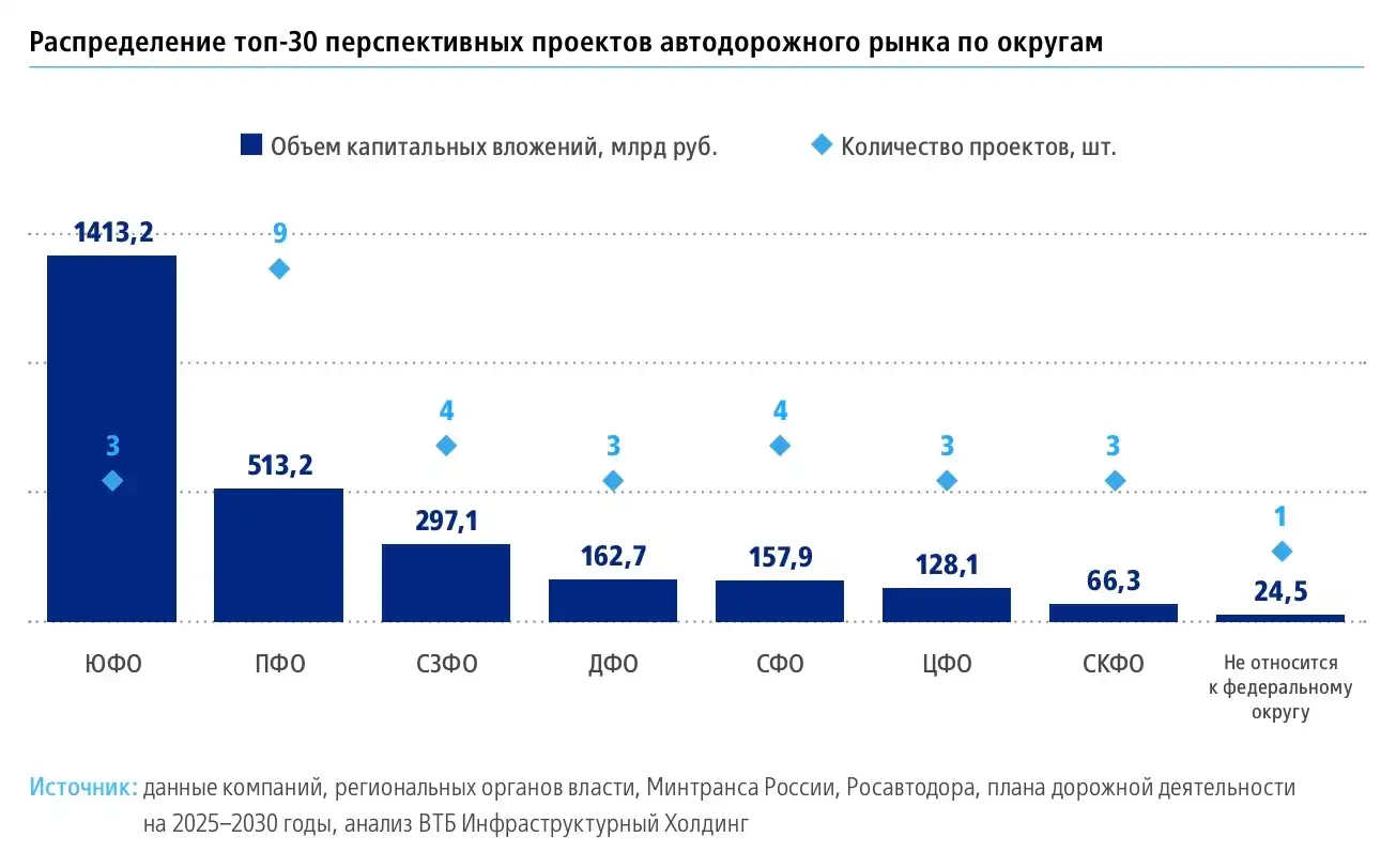 РАСПРЕДЕЛЕНИЕ ТОП-30 ПЕРСПЕКТИВНЫХ ПРОЕКТОВ АВТОДОРОЖНОГО РЫНКА ПО ОКРУГАМ