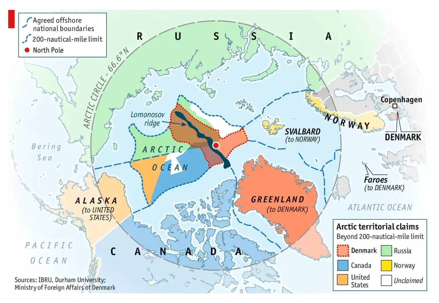 Правовой статус многих арктических территорий и морских пространств остается предметом споров между приарктическими государствами. Ключевой конфликт разворачивается вокруг определения границ континентального шельфа, особенно в районе хребта Ломоносова, на который претендуют Россия, Дания и Канада.