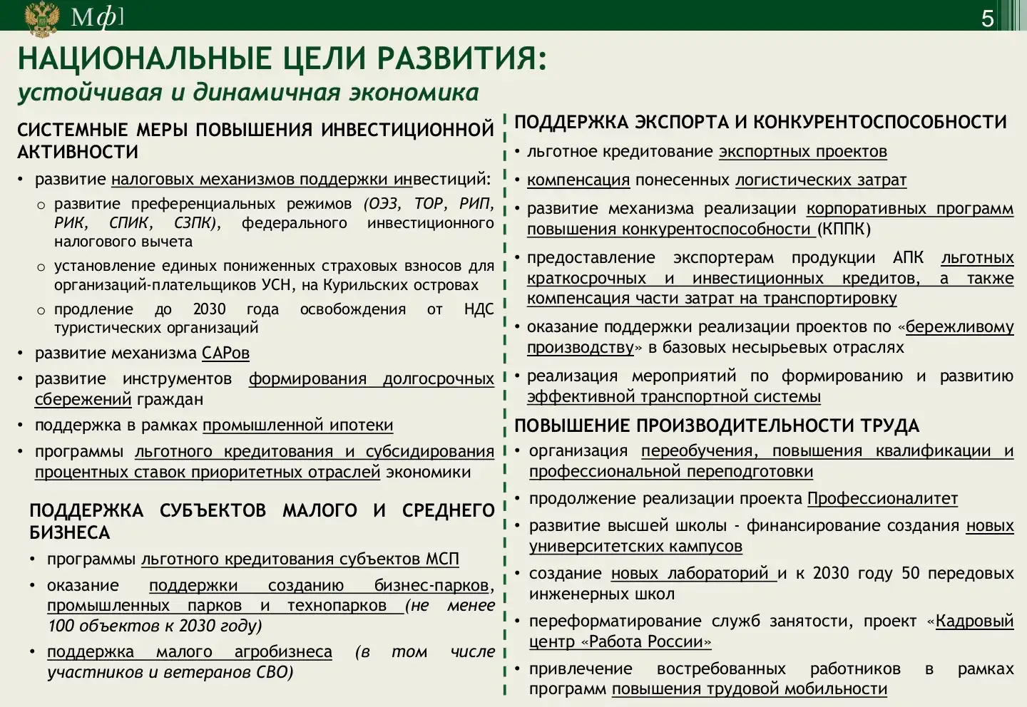 Особое внимание уделяется поддержке семьи, здравоохранения, образования, а также развитию инфраструктуры и регионов. Бюджетная политика нацелена на повышение инвестиционной активности и конкурентоспособности несырьевого сектора.