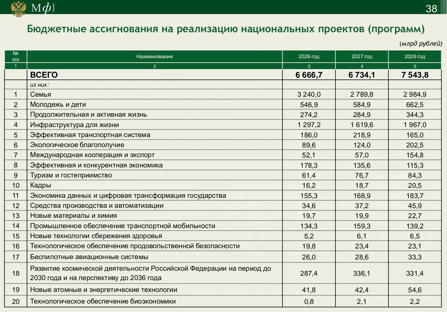 Бюджет нацпроектов 2026-2028: приоритет — семья и инфраструктура. Рост расходов на экологию и экспорт. Стабильное финансирование космоса и цифровизации. Анализ распределения 6,7-7,5 трлн рублей.