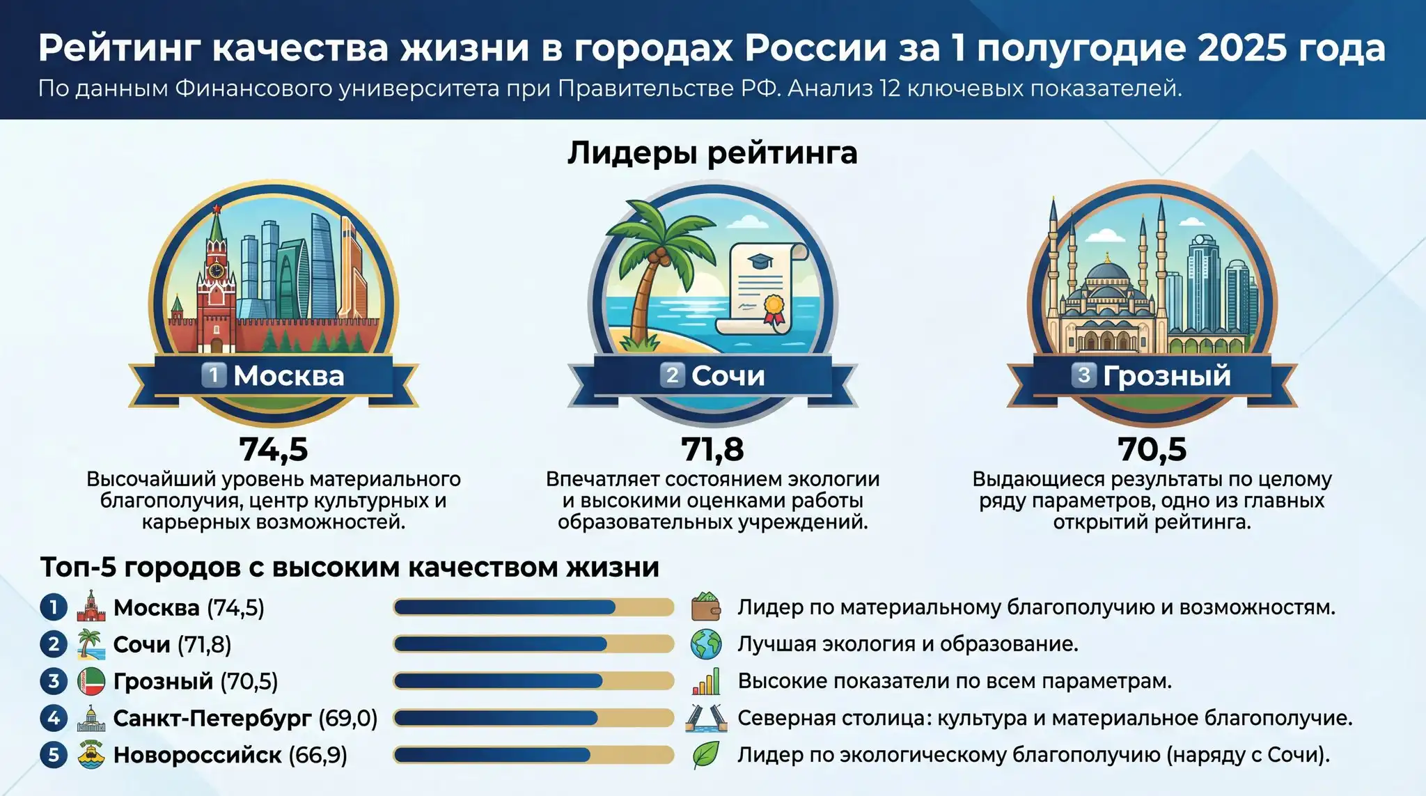 Рейтинг качества жизни в городах России за 1 полугодие 2025 года. Лидеры - Москва, Сочи, Грозный. Анализ 12 ключевых показателей от Финансового университета при Правительстве РФ.