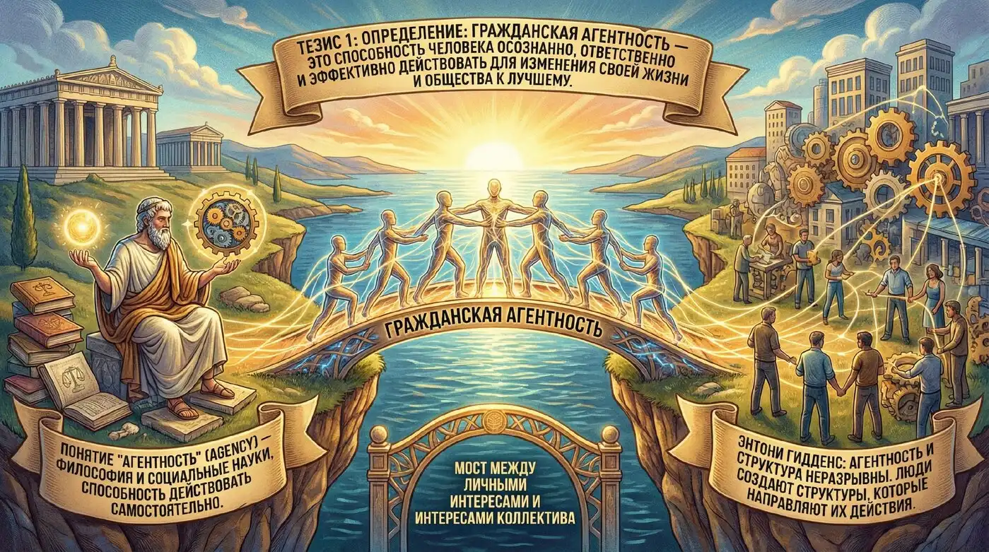 Тезис 1: Определение: Гражданская агентность — это способность человека осознанно, ответственно и эффективно действовать для изменения своей жизни и общества к лучшему.