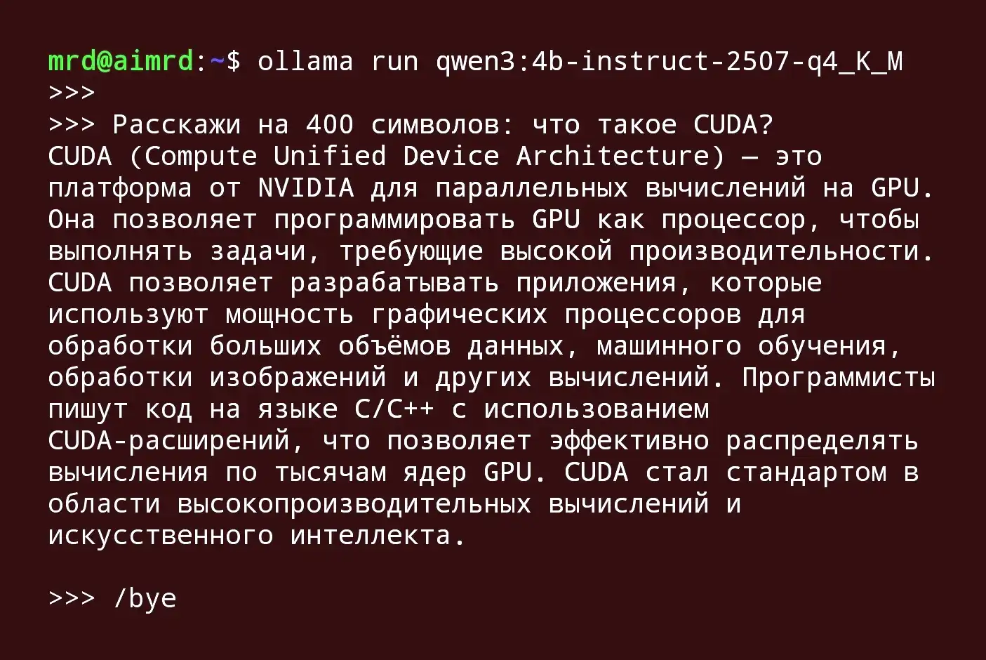 Это базис и делает возможным обучение и работу гигантских моделей. Этим фундаментом являются две «рабочие лошадки» высокопроизводительных вычислений: язык C++ и платформа CUDA. Именно их симбиоз позволяет таким библиотекам, как ggml и llama.cpp, эффективно работать на оборудовании NVIDIA, принося магию больших языковых моделей даже на ваш персональный компьютер.