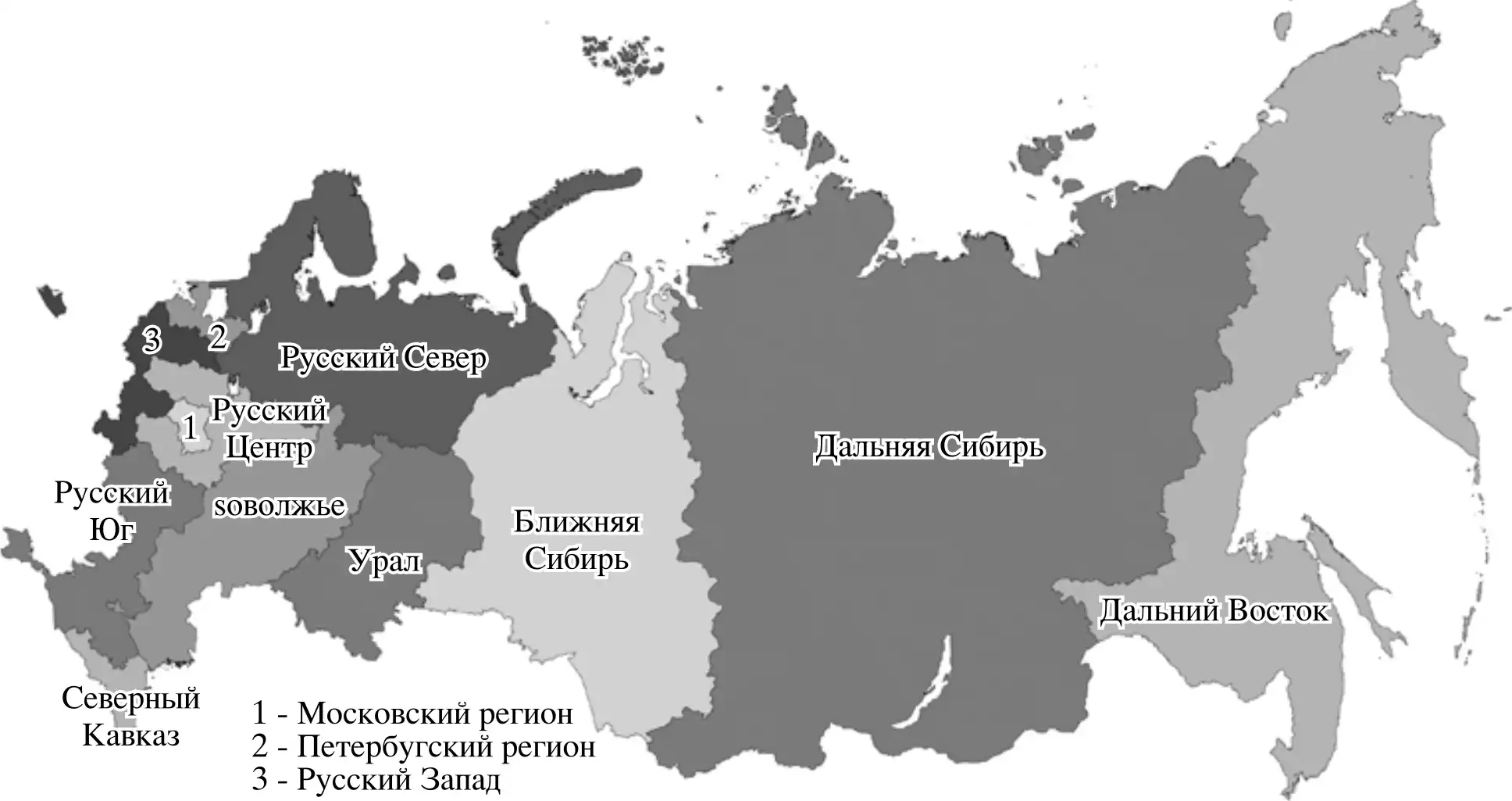 Как и Ю.А. Ведениным, на первом иерархическом уровне, при выделении крупных культурно-географических регионов нами использовались исторический (история формирования культурного пространства страны) и этнокультурный критерии. Вместе с тем в наименовании регионов с прилагательным русский подчеркивается не столько их этничность, преобладание по численности русского населения, сколько их роль в формировании русской культуры и русской идентичности.