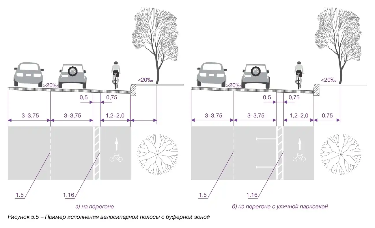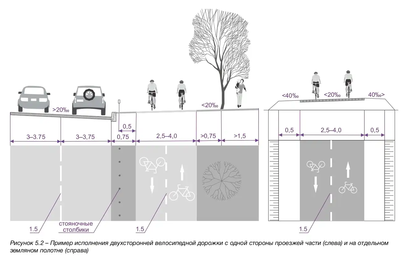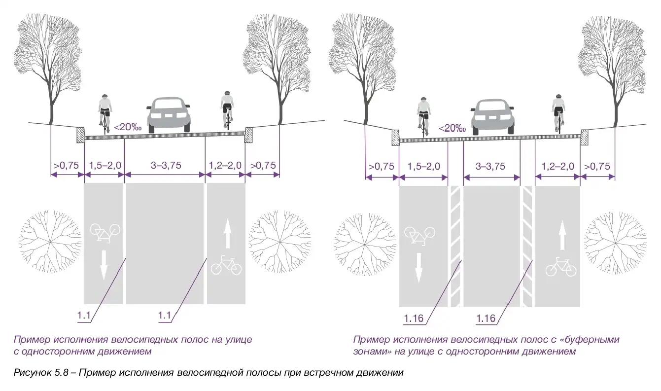 - Ширина велополосы: минимум 1,0 м, желательно 1,5 - 2,5 м.
