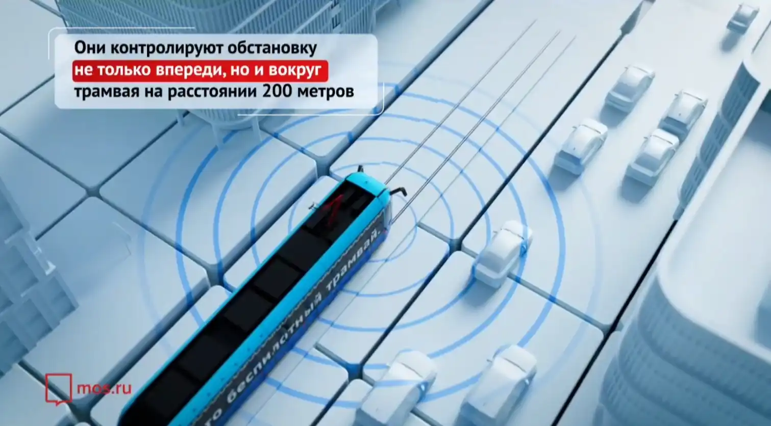Они контролируют обстановку не только впереди, но и вокруг трамвая на расстоянии 200 метров. Такой большой радиус обзора дает системе достаточно времени для безопасного и плавного реагирования на любые изменения на пути.
