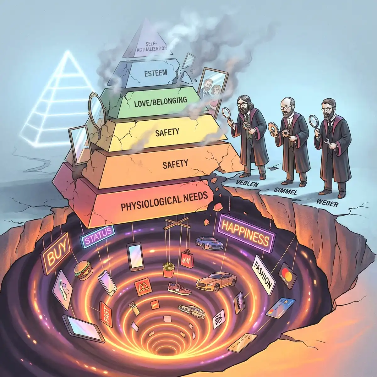 Жизнь посмеялась над Маслоу. Веблен, Зиммель и Вебер показали, что базовые нужды — это поле статусных игр. А Вэнс Паккард доказал: реклама умеет создавать искусственные желания, чтобы мы вечно оставались «счастливыми» потребителями на первом этаже.