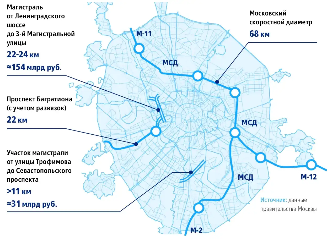 Магистраль от Ленинградского шоссе до 3-й Магистральной улицы: Протяженностью 22–24 км, этот проект будет реализовываться ООО «Дороги Москвы — Магистральная». Объем инвестиций в строительство оценивается в колоссальные 154 млрд рублей.