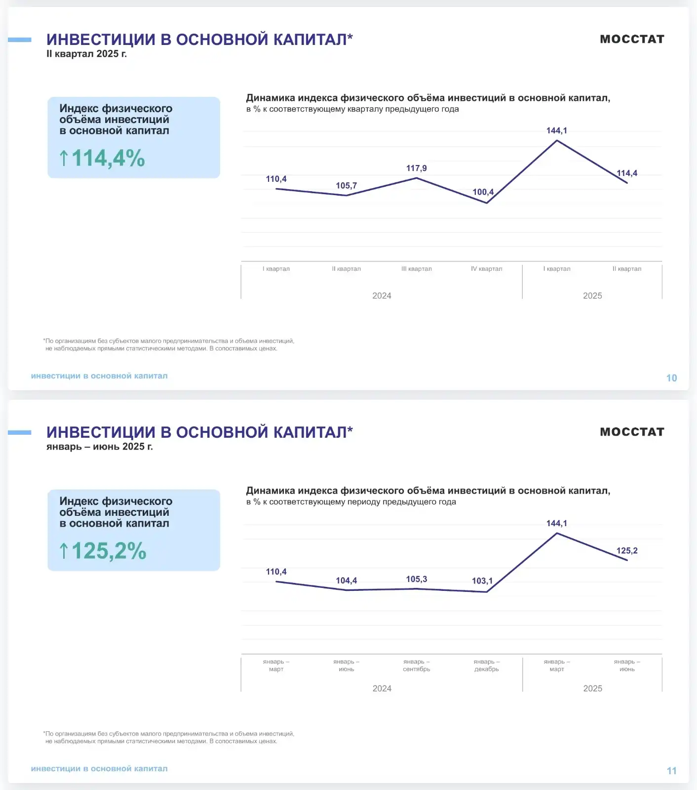 Обоснование: На этом изображении представлены ключевые графики динамики индекса физического объема инвестиций в основной капитал как поквартально (II квартал 2025 г. – 114,4%), так и за первое полугодие в целом (125,2% к аналогичному периоду 2024 года).