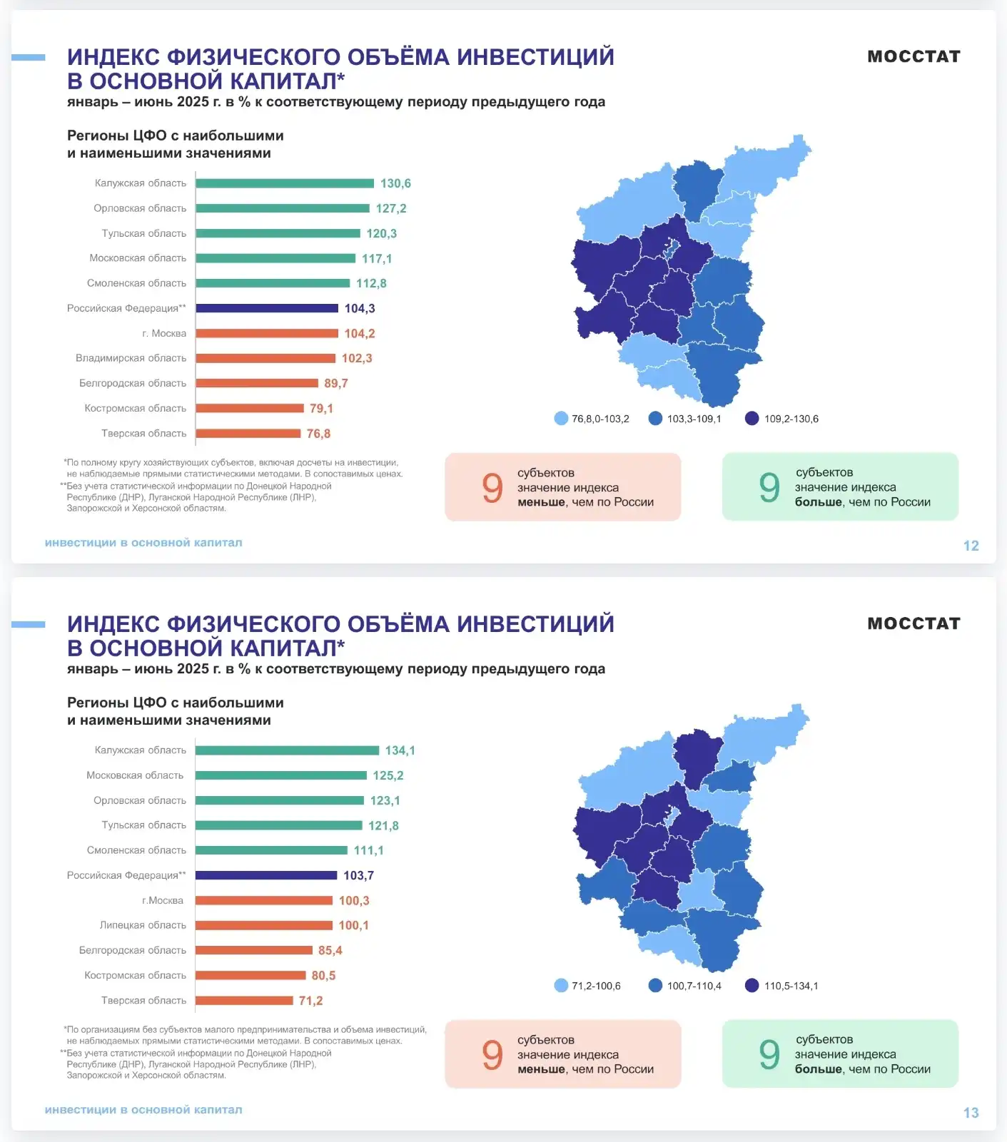 Анализ данных по регионам Центрального федерального округа (ЦФО) выявляет значительную дифференциацию. В лидерах по индексу физического объема инвестиций за первое полугодие 2025 года находятся Калужская (130,6%), Орловская (127,2%) и Тульская (120,3%) области, а также Московская область (117,1%).