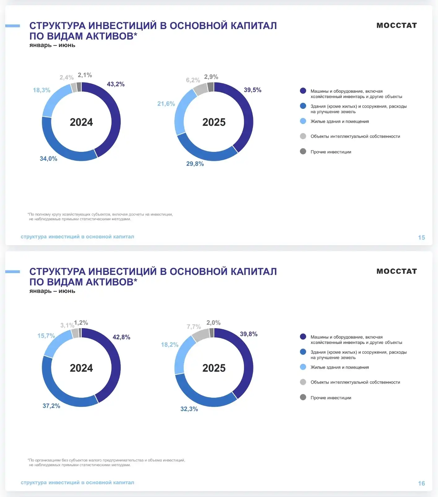 Обоснование: Это изображение содержит круговые диаграммы, показывающие структуру инвестиций по видам активов (машины и оборудование, здания, объекты интеллектуальной собственности и т.д.) за 2024 и 2025 годы.