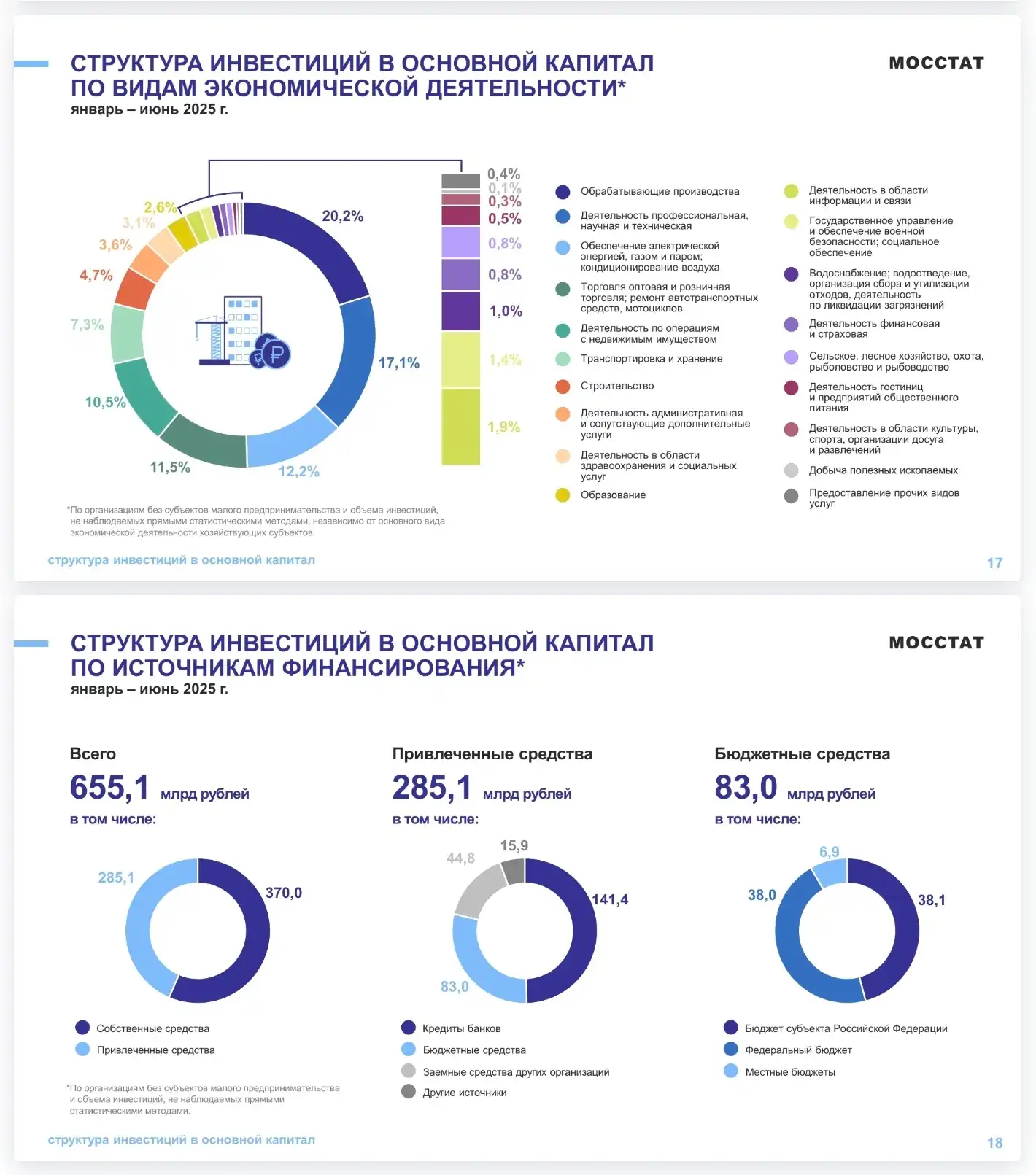 Анализ данных Мосстата за январь-июнь 2025: инвестиции в основной капитал выросли на 25,2% в реальном выражении. Рост обеспечили модернизация оборудования, госинвестиции в IT и инфраструктуру. Изучаем структуру, источники и диспропорции.