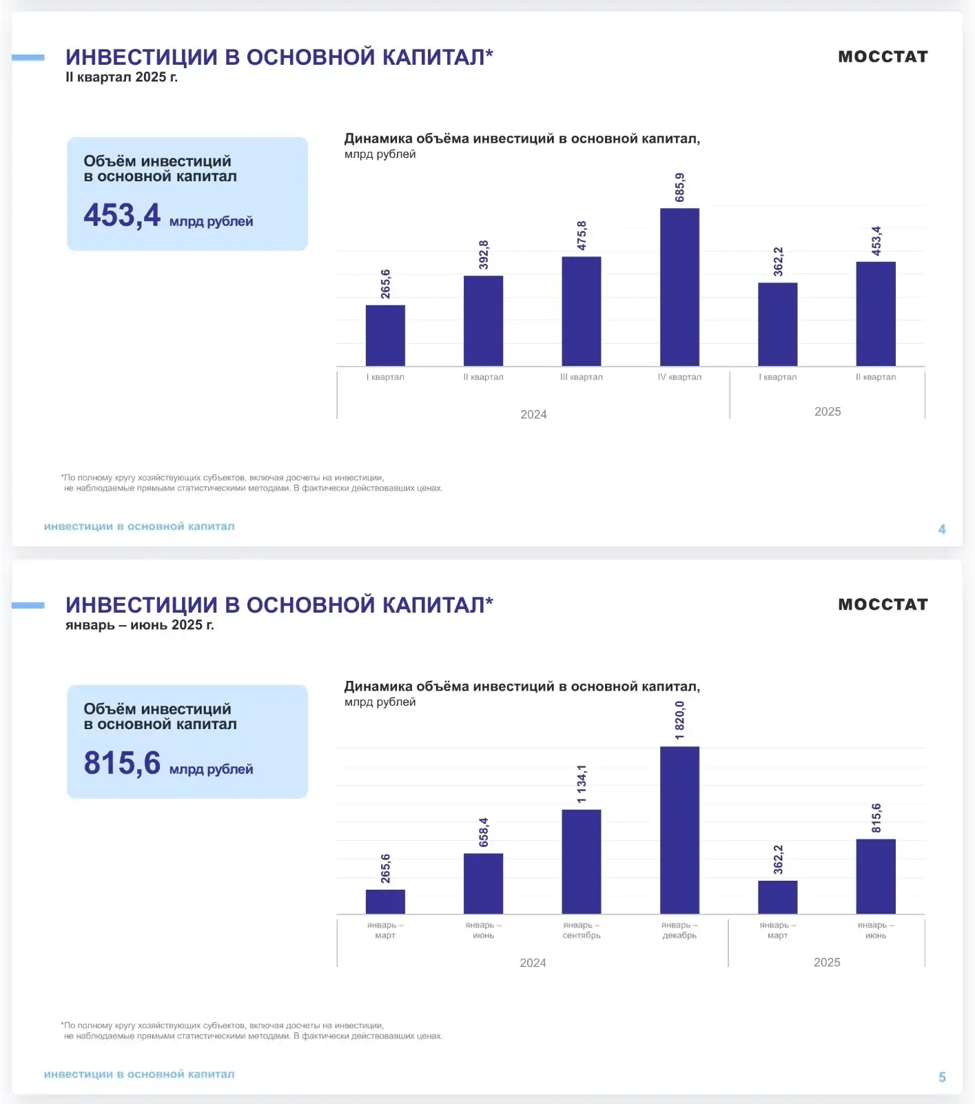 Обоснование: На этом изображении представлены данные об объеме инвестиций в основной капитал в фактически действовавших ценах (номинальный объем) за II квартал (453,4 млрд руб.) и за первое полугодие (815,6 млрд руб.) 2025 года, а также динамика этих показателей.