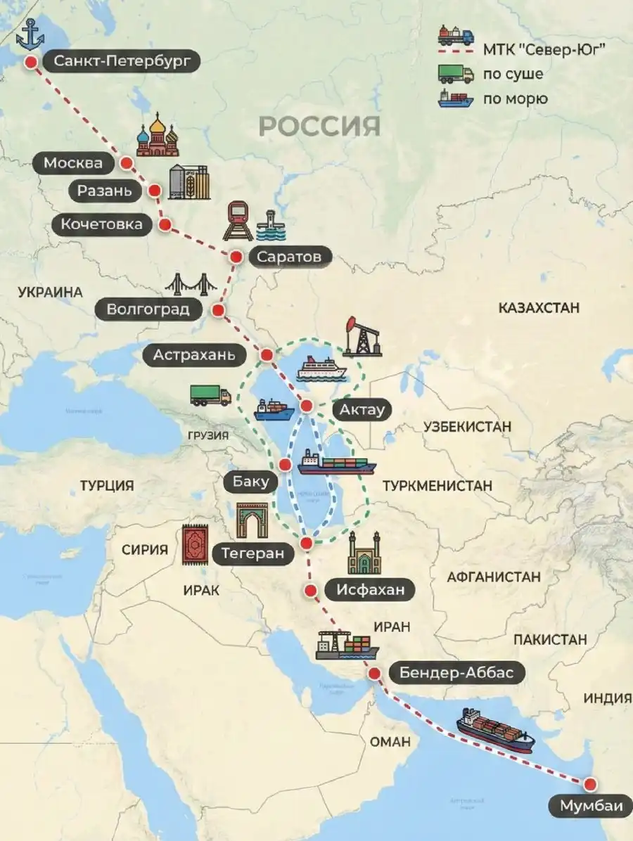 1️⃣ Западный (сухопутный): Пролегает по западному побережью Каспия через Россию (Дагестан), Азербайджан и Иран. Это самый короткий сухопутный путь, но он требует преодоления горных участков и стыковки железнодорожных систем.