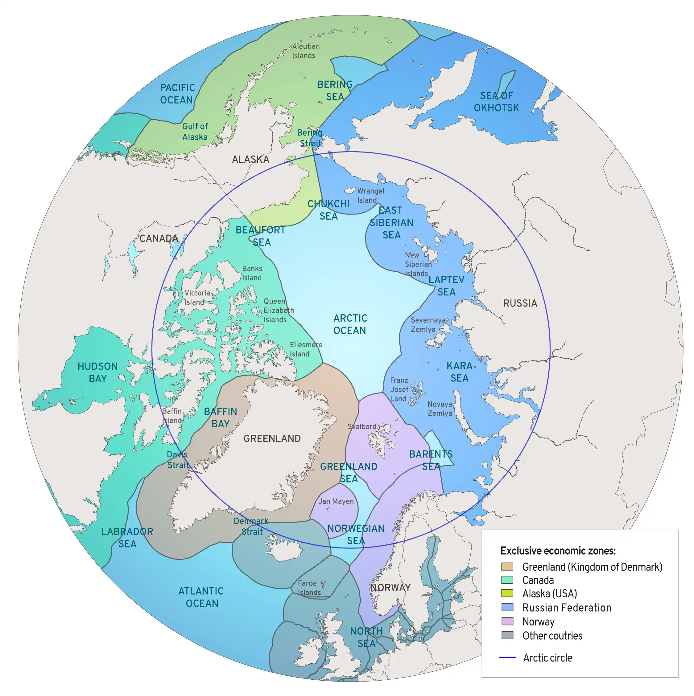 С одной стороны, Россия и Канада исторически отстаивают секторальный принцип, согласно которому границы их вларений проходят по меридианам от побережья до Северного полюса. Россия апеллирует к сложившейся в 1920-х годах обычной норме международного права.