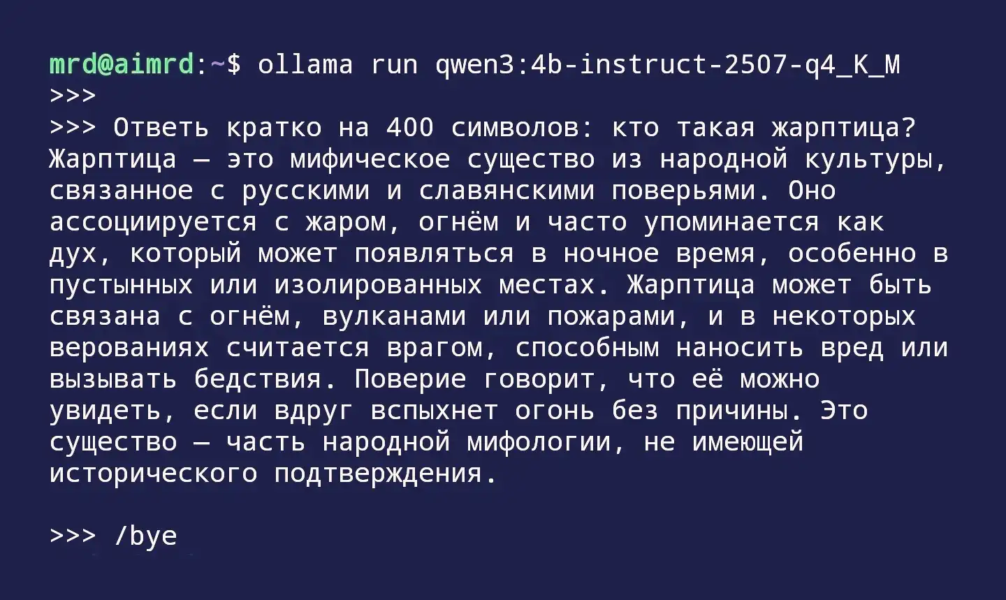 🏡 Хороший тест: Задайте вопрос на знание локального контекста или синонимов: «Объясни разницу между словами 'предать' и 'передать'» или «В чем заключается парадокс Банаха-Тарского?». Качественная русскоязычная модель даст внятное, связное объяснение, в то время как слабая может сгенерировать бессмыслицу или перейти на английский.