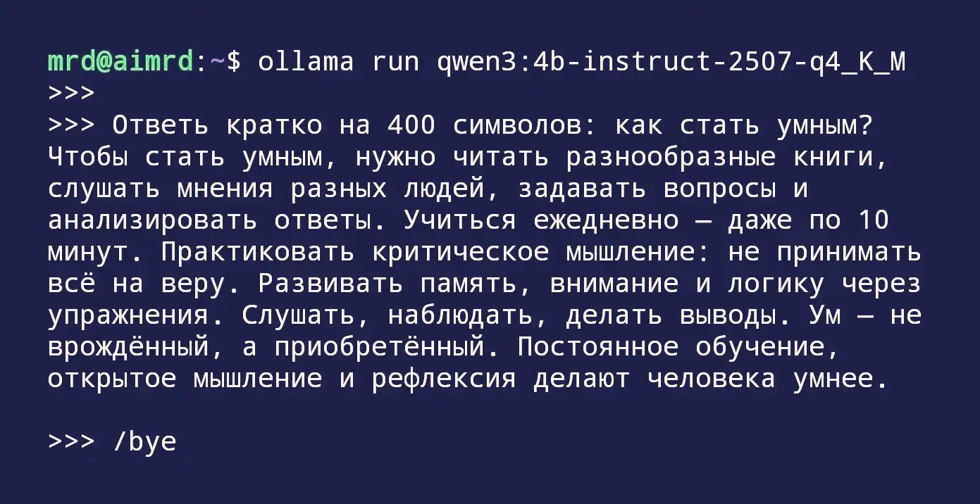 Легковесные модели — это инструмент для конкретной работы, который всегда под рукой. Модели класса 7B и выше — это уже интеллектуальные партнеры, способные на творчество и сложные рассуждения, но требующие за это более солидных аппаратных "инвестиций".