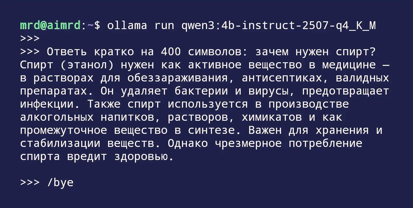 - Качество ответов: Ответы будут краткими, буквальными и лишенными глубокого анализа. Модель хорошо справляется с простыми инструкциями: «перефразируй это предложение», «классифицируй отзыв как положительный или отрицательный», «извлеки из текста дату и место».