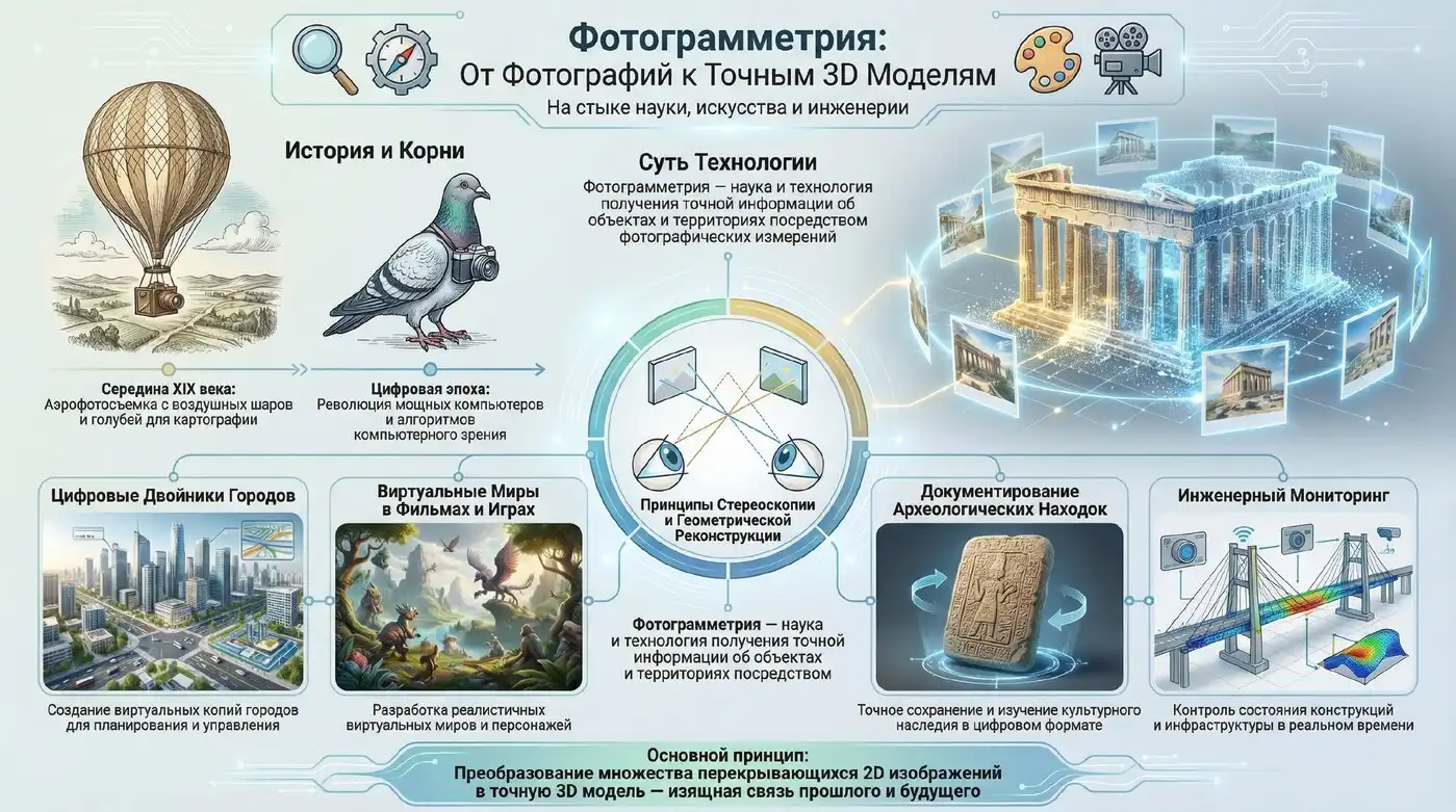 Фотограмметрия: наука создания 3D-моделей по обычным снимкам. Принцип работы, оборудование, сферы применения от картографии до геймдева. Преимущества, ограничения и будущее технологии с ИИ и цифровыми двойниками.