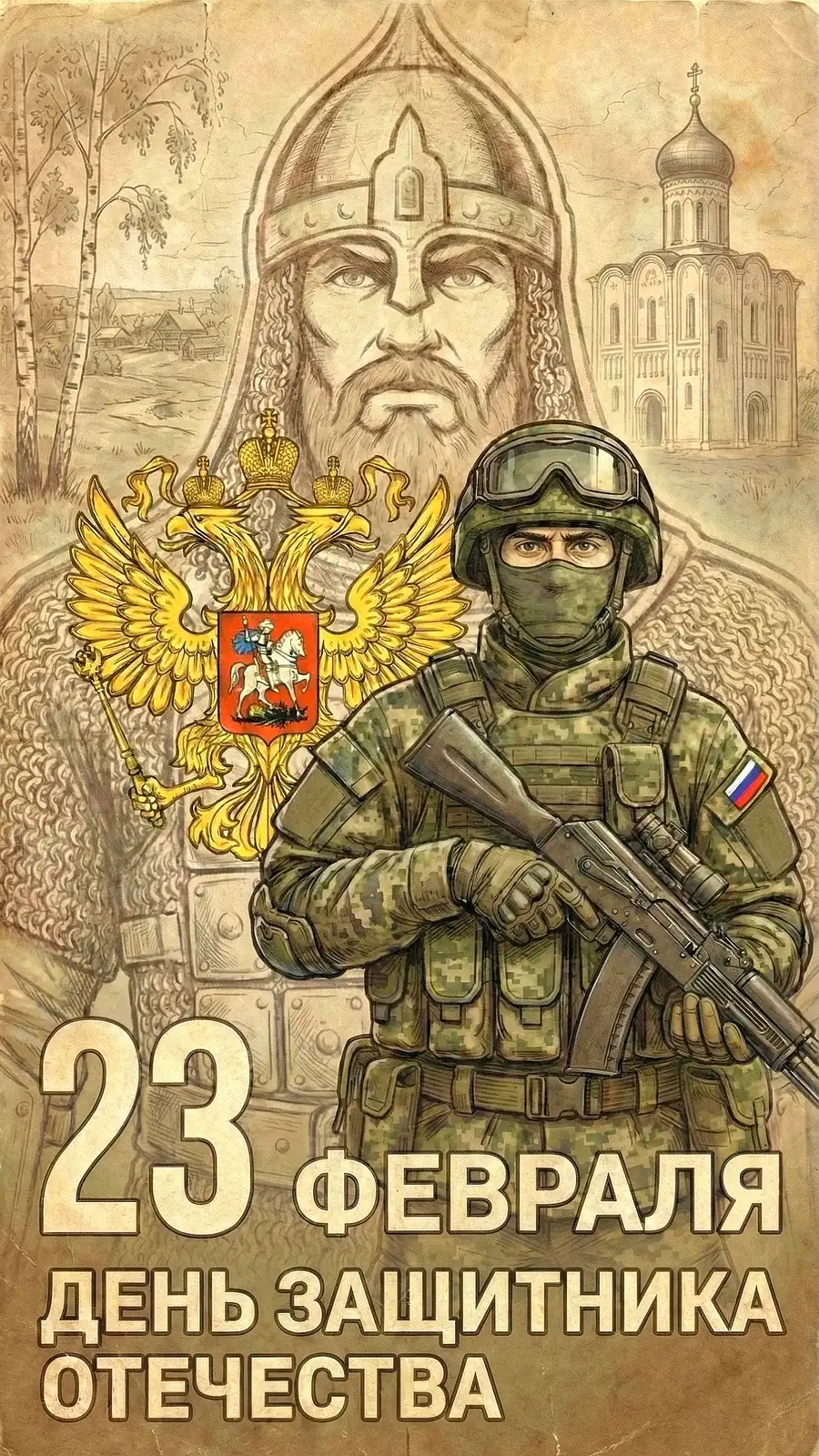 Эта открытка — не просто поздравление. Это напоминание о том, что Доблесть не знает срока давности. Она передается по наследству — от кольчуги к камуфляжу, от меча к автомату, от сердца богатыря к сердцу современного солдата.