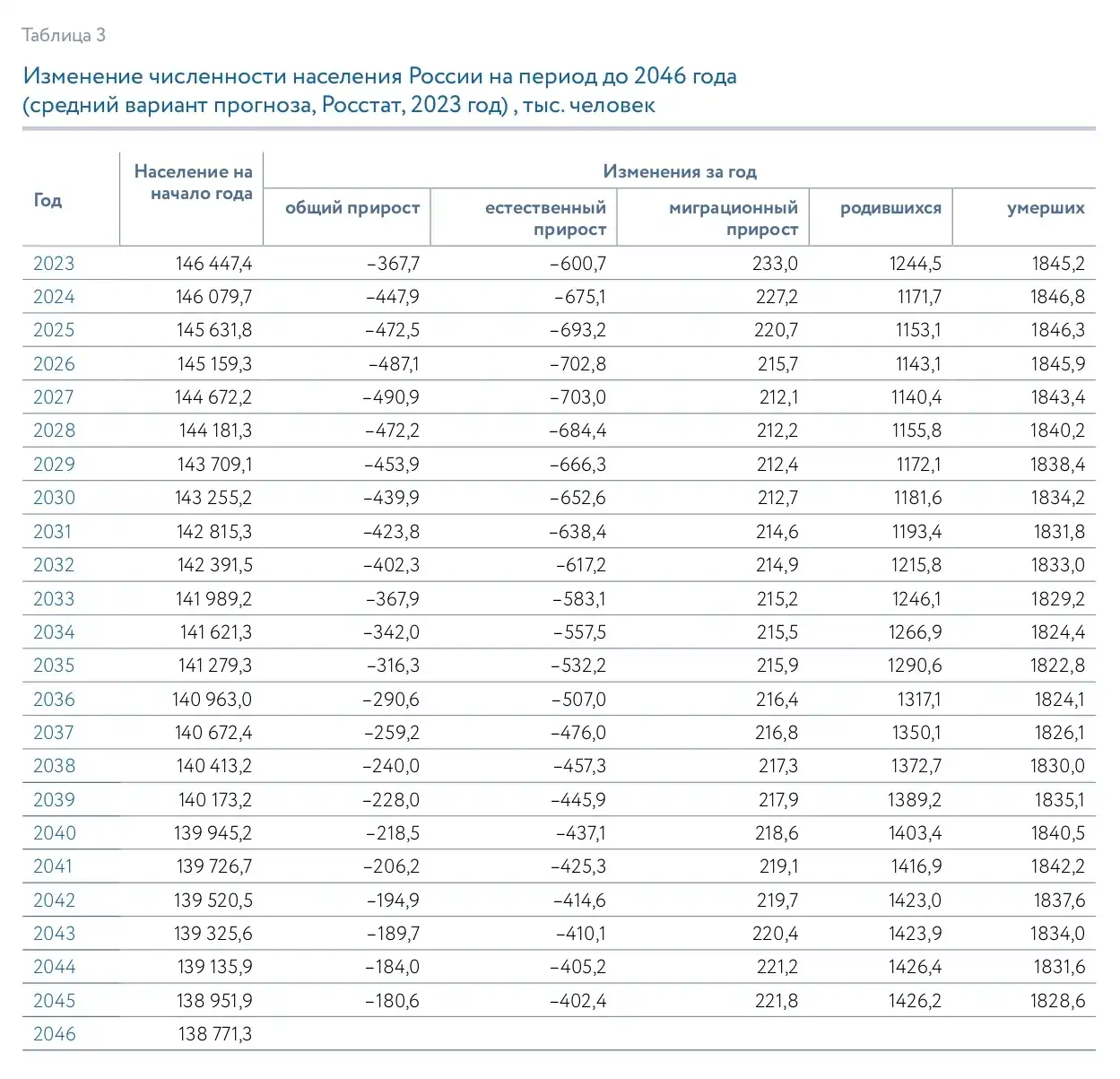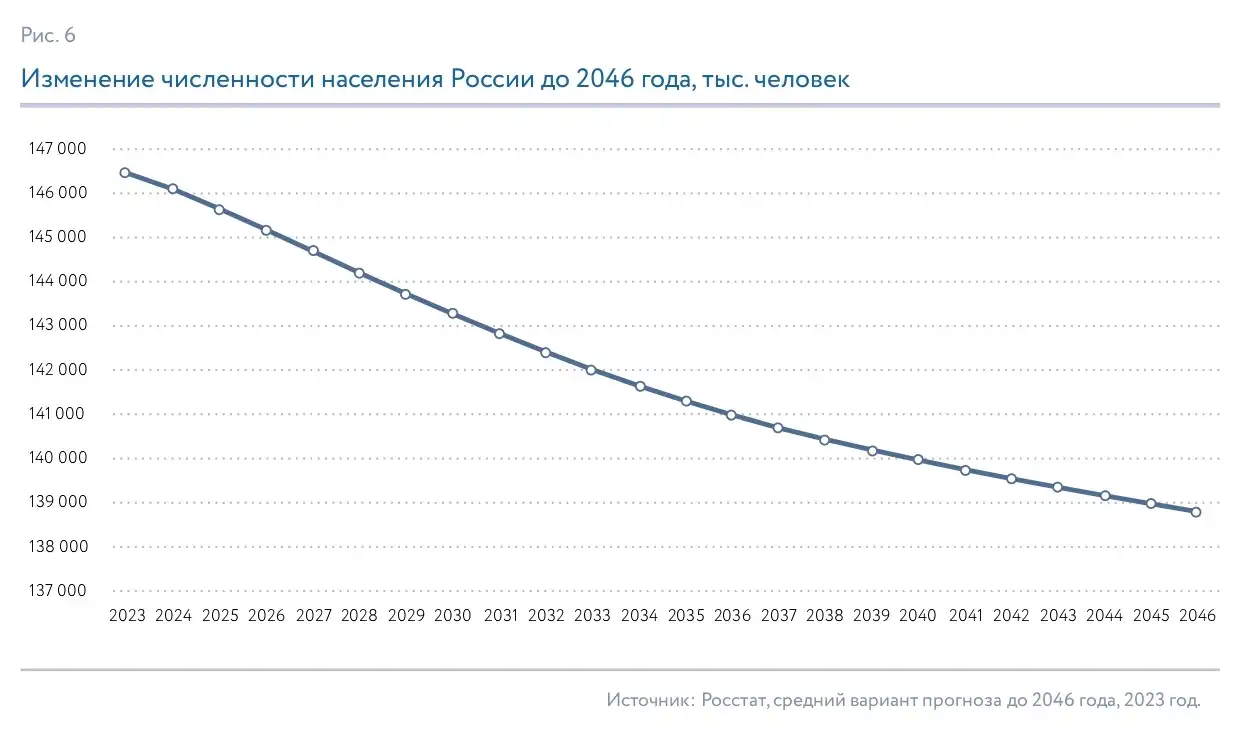 По новому демографическому прогнозу, население России к 2030 году может сократиться на 3,1 млн человек, до 143,2 млн человек, по сравнению с 2023 годом, а общие потери от естественной убыли за этот период составят более 5,3 млн человек, которые только на 2,1 млн человек будут компенсированы миграцией.