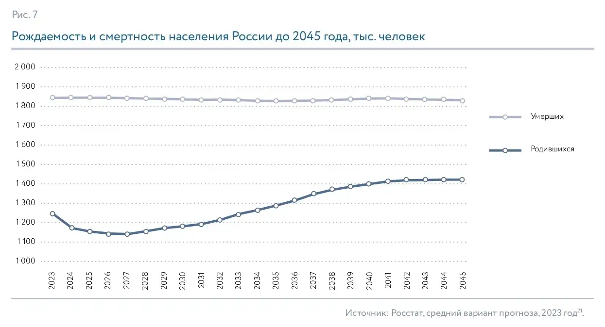 Рождаемость и смертность населения России до 2045 года, тыс. человек