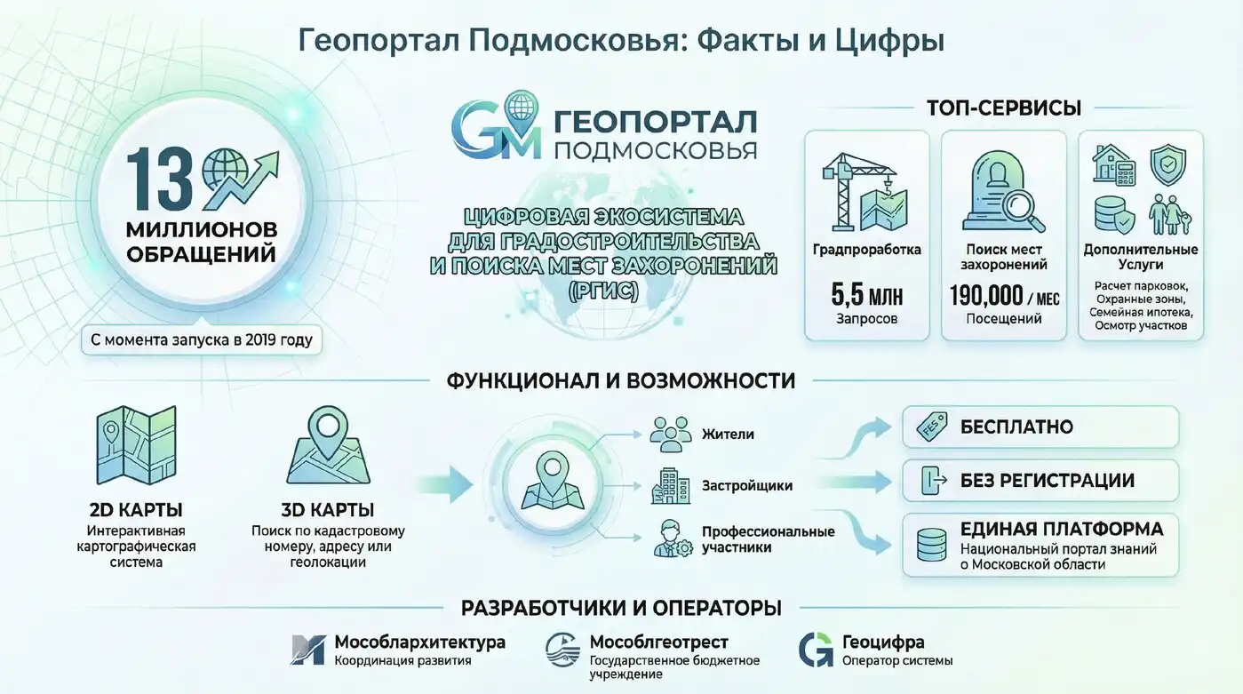 Геопортал Подмосковья — 13 млн обращений, топ-сервисы: «Градпроработка» (5,5 млн), поиск захоронений (190 тыс. за месяц). 2D- и 3D-карты, проверка участков, расчёт парковок, зоны охраны, семейная ипотека. Бесплатно, без регистрации. Работает с 2019 года.