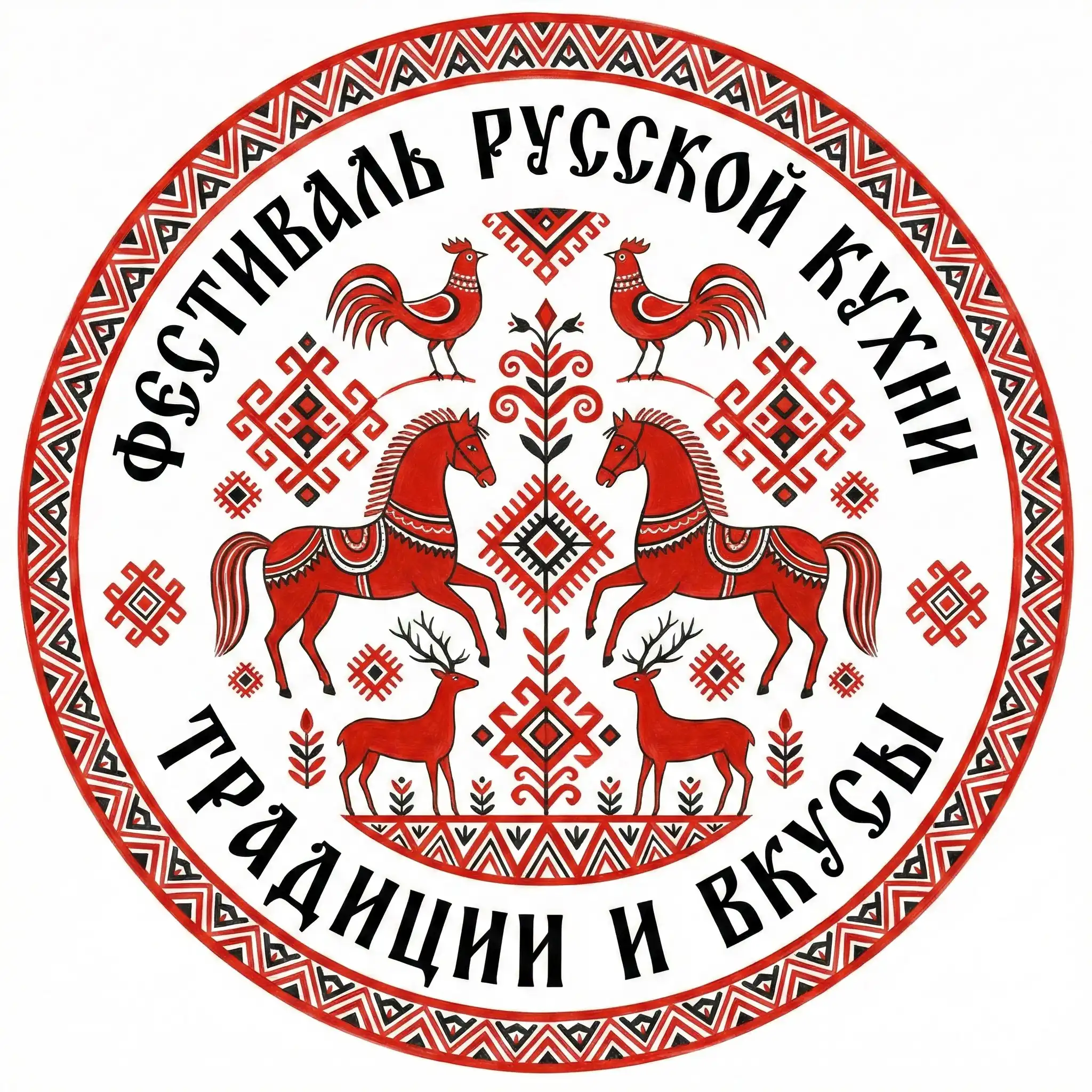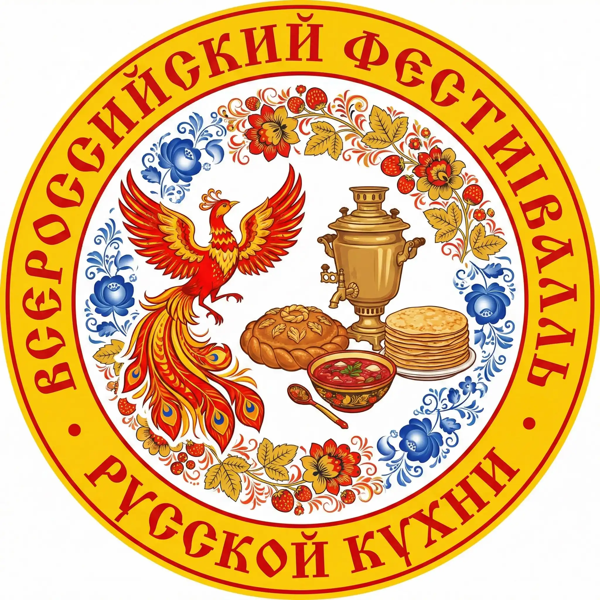 Логотип фестиваля русской кухни — это гастрономическая поэма, в которой оживают традиции. В центре композиции — жар-птица, чей огненный хвост превращается в золотые завитки хохломы, синие розы гжели и графичные линии мезени. Ее крылья распахнуты, словно скатерть-самобранка, несущая главные символы застолья: румяные блины, тульский самовар, связку калачей и расписную миску с пельменями.