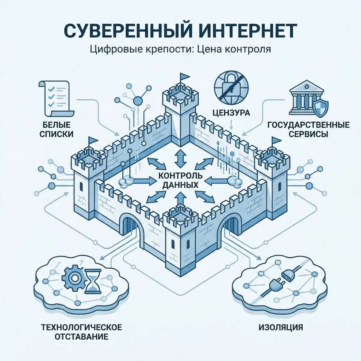 Исследуем феномен суверенного интернета: белые списки, цензура и государственные сервисы. Зачем страны строят цифровые крепости и какую цену платят за контроль — технологическое отставание и изоляция.