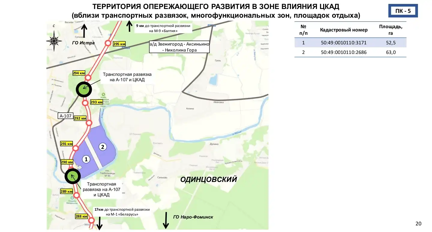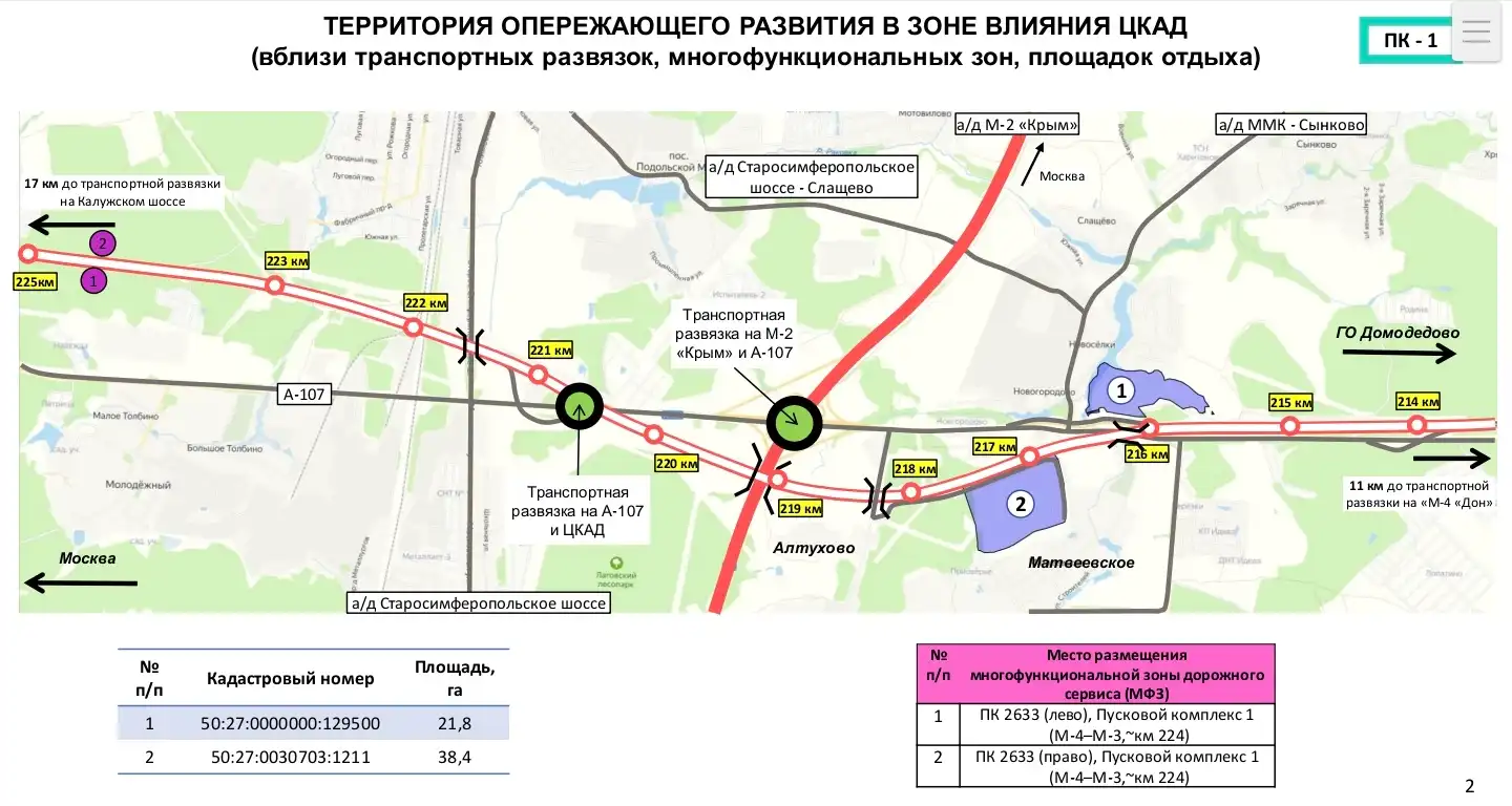 - Расстояние до ЦКАД: Непосредственно вдоль трассы: 49 и 50 км трассы.