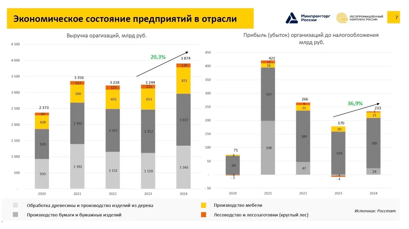С 2021 по 2024 год производство фанеры сократилось на 23%, пеллет — на 53%, пиломатериалов — на 11%. Экспортные поставки упали ещё значительнее: по фанере — на 44%, по пеллетам — на 75%, по пиломатериалам — на 29%.