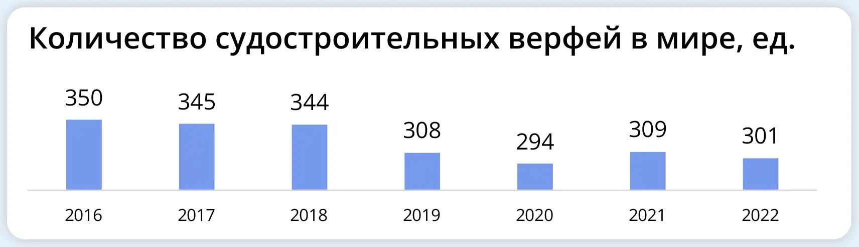 Несмотря на рост объемов строительства, количество судостроительных верфей в мире демонстрирует тенденцию к постепенному сокращению, что свидетельствует о процессах оптимизации и укрупнения.