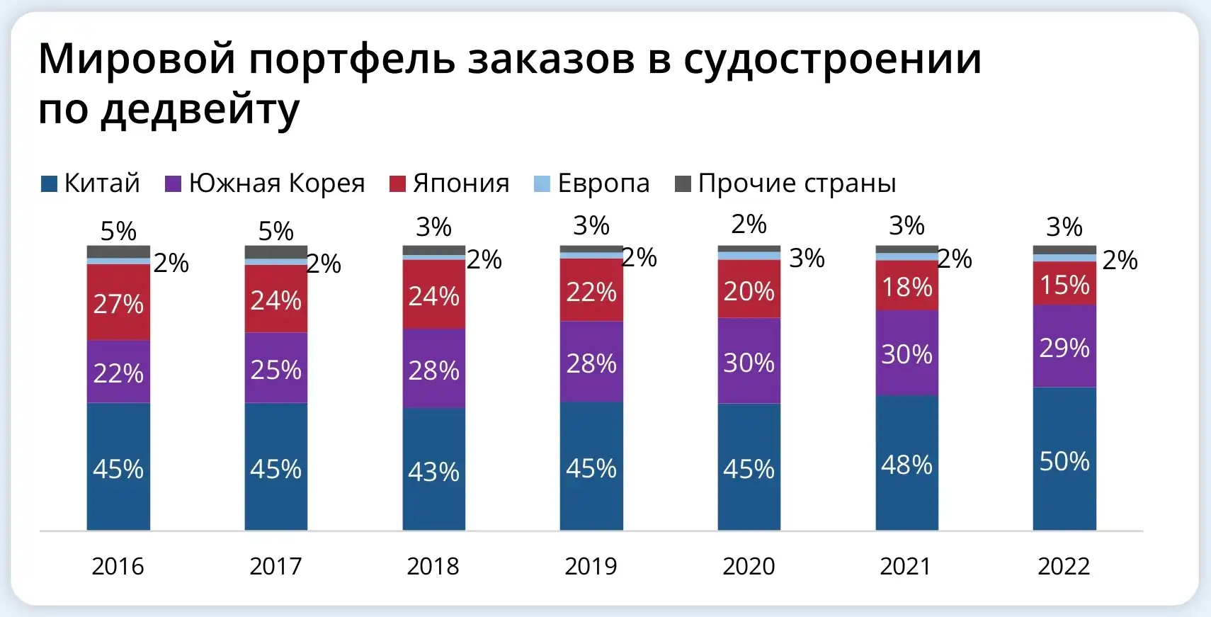 Распределение мирового портфеля заказов по дедвейту (суммарной грузоподъемности судов) подтверждает лидерство Китая и показывает долгосрочную стабильность сложившейся расстановки сил.