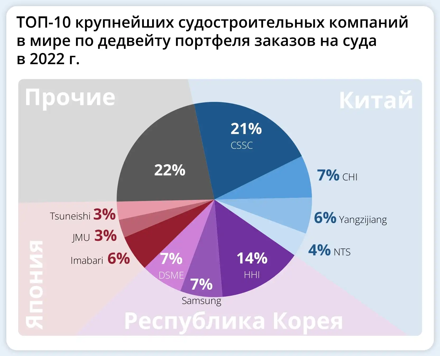 Одной из самых примечательных характеристик современного судостроения является его крайне высокая консолидация. Согласно данным за 2022 год, 78% всех заказов сосредоточены в портфелях всего десяти крупнейших судостроительных компаний мира.